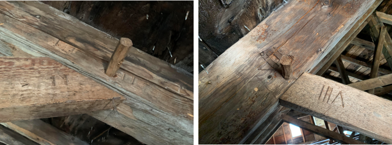 “The Great Meetinghouse,” as it was called then, was prefabricated on the Kennebec River in Maine, a large Quaker outpost. The building was then disassembled, shipped into Cape Cod Bay, unloaded in the creek north of Spring Hill, and reassembled at the present site according to matching Roman numerals on the timbers, as shown below. These markings are visible in the attic. There are carriage sheds on either side of the meetinghouse.
